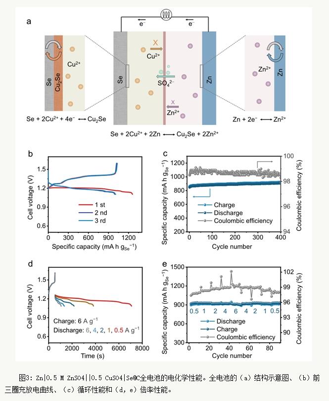 由于在充放電過程中的中間產(chǎn)物難溶于水,因此可以從根源上避免有機(jī)系Se基電池中多硒化物的穿梭效應(yīng)。Cu|0.5 M CuSO4|Se@C-48紐扣電池能夠在5分鐘內(nèi)充電800 mAh gSe?1(充電電流10 A g?1)。且當(dāng)Se@C中Se含量提高至65%時(shí),電池的快充性能無明顯變化(圖2)。Zn|0.5 M ZnSO4 ||0.5 CuSO4 |Se@C全電池可以在9分鐘內(nèi)的充電到900 mAh gSe?1,顯示出具有發(fā)展為快充電池的潛力(圖3)。第一性原理計(jì)算表明,放電中間產(chǎn)物具有優(yōu)異的電子導(dǎo)電率,此外,充放電過程中的體積效應(yīng)能夠促進(jìn)充放電速率。