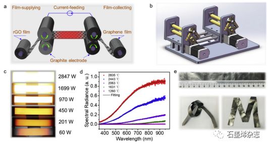 Figure 1. (a)連續電熱示意圖,(b)連續電熱裝置,(c)石墨烯膜電熱過程中的照片,(d)不同溫度的光譜圖,(e)所制備的柔性石墨烯導熱膜。