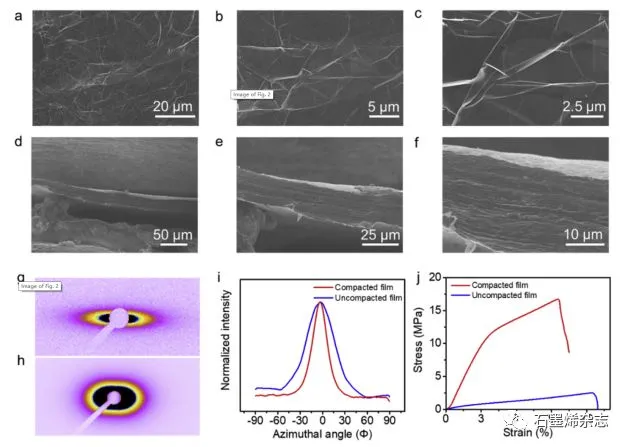 Figure 2. (a-c)石墨烯膜的表面形貌,(d-f)石墨烯膜的斷面形貌,(g)連續輥壓的電熱處理石墨烯膜的SAXS圖案,(h)未輥壓的石墨烯膜的SAXS圖案,(i)對應的SAXS方位角積分曲線,(j)石墨烯膜的力學性能。