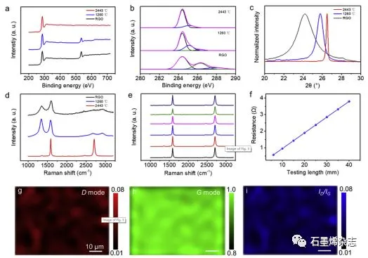 Figure 3.不同電熱溫度熱處理石墨烯膜的(a,b)XPS、(c)XRD、(d)Raman表征;(e)石墨烯膜不同位置的拉曼光譜,間隔距離為1cm;(f)石墨烯膜電阻與測試長度的關系,表明制備的石墨烯膜宏觀尺寸均勻;(g-i)石墨烯膜的拉曼成像掃描,證明石墨烯膜微觀尺寸結構均勻。