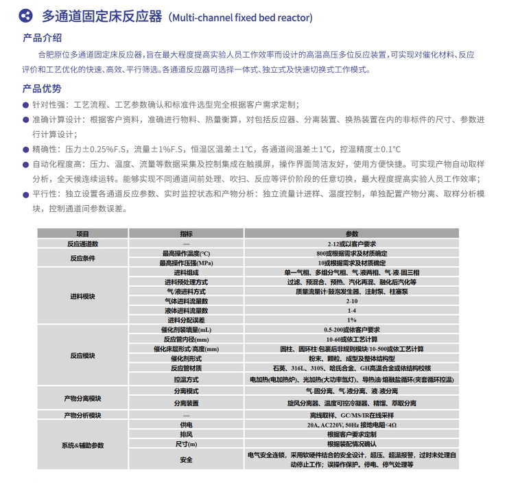 多通道固定床反應器: 合肥原位多通道固定床反應器,旨在最大程度提高實驗人員工作效率而設計的高溫高壓多位反應裝置,可實現對催化材料、反應評價和工藝優化的快速、高效、平行篩選。各通道反應器可選擇一體式、獨立式及快速切換式工作模式。 產品優勢: 針對性強:工藝流程、工藝參數追認和標準件選型完全根據客戶需求定制; 準確計算設計:根據客戶資料,準確進行物料、熱增衡算,對包括反應器、分離裝置、換熱裝置在內的非標件的尺寸、參數進行計算設計; 精確性:壓力±0.25%F.S,流量±1%F.S,恒溫區溫差±1℃,各通道間混差±1℃,控溫精度±0.1℃ 自動化程度高:壓力、溫度、流量等數據采集及控制集成在觸摸屏,操作界面簡潔友好,使用方便快捷。可實現產物自動取樣分析,全天候連續運轉。能夠實現不同通道間前處理、吹掃、反應等評價階段的任意切換,最大程度提高實驗人員工作效率; 平行性:獨立設置各通道反應參數、實時監控狀態和產物分析:獨立流量計進樣、溫度控制,單獨配置產物分離、取樣分析模塊,控制通道間參數誤差。
