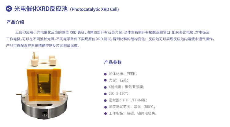 光電催化xrd反應池應用于光電催化反應的原位 XRD 表征,池體頂部開有石英光窗,池體左右側開有聚膚亞胺窗口,配有參比電極、對電極及工作電極,可以在不同該長光照,不同電學條件下實現(xiàn)原位 XRD測試,得到材料的結構變化;反應池可以實現(xiàn)反應池內(nèi)溶液中通氣操作,產(chǎn)品可選溫控系統(tǒng)精確控制反應池測試溫度。