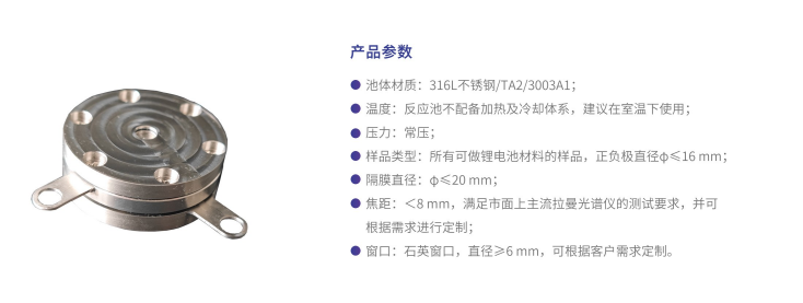 鋰電池原位拉曼測試池主要用于鋰離子反應(yīng)體系中材料的拉曼光譜數(shù)據(jù)采集,可對鋰電池電極材料化學反應(yīng)過程中的電極結(jié)構(gòu)進行研究。 產(chǎn)品參數(shù): 池體材質(zhì):316L不銹鋼/TA2/3003A1; 溫度:反應(yīng)池不配備加熱及冷卻體系,建議在室溫下使用; 壓力:總壓; 樣品類型:所有可做鋰電池材料的樣品,正負極直徑φ≤16mm; 隔膜直徑φ≤20mm; 焦距:< 8mm,滿足市面上主流拉曼光譜儀的測試要求,并可根據(jù)需求進行定制; 窗口:石英窗口,直徑≥6mm,可根據(jù)客戶需求定制。