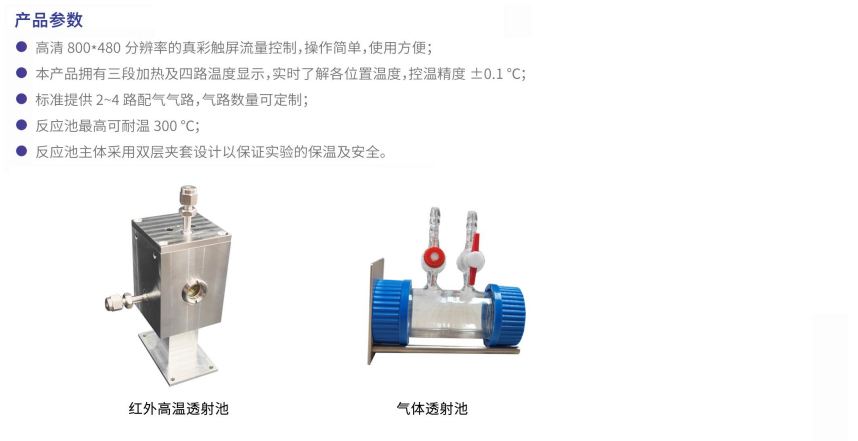 原位紅外透射池反應系統主要用于研究樣品在不同溫度和氣體環境下的紅外光譜特征.產品主要由反應池、混氣控制系統及溫度控制系統三部分構成.其中反應池主體采用316L不銹鋼材質,并配備紅外窗片,混氣控制系統通過質量流量計精確控制各路氣體流量并實現混合,溫度控制系統通過各類傳感器實現對氣路、混氣候及反應池溫度的控制.