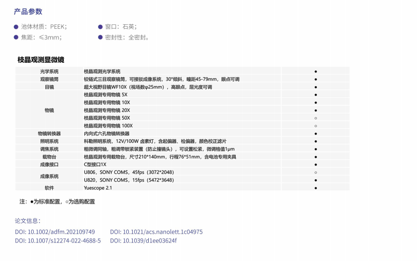 枝晶觀測專用托架 標配適合枝晶觀測的專用載物臺,以及多款不同功能的專用夾具,能夠適用各種不同規格電解池。 產品介紹 反應池可用于全方位觀測金屬負極在充放電過程中的枝晶生長/溶解過程,滿足不同金屬負極(鋰、鈉、鋅等)的觀測需求,設計簡單,密封性好,掾作方便,可重復性使用。