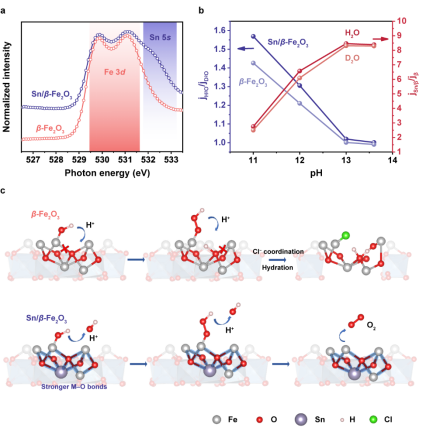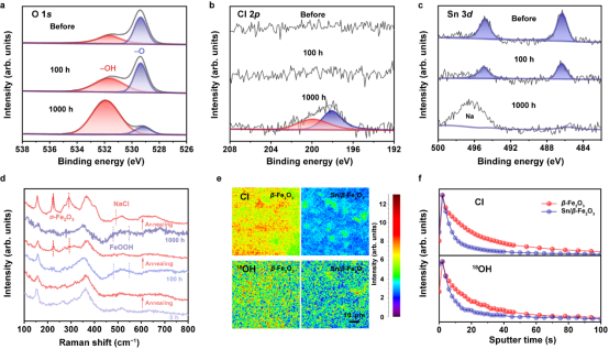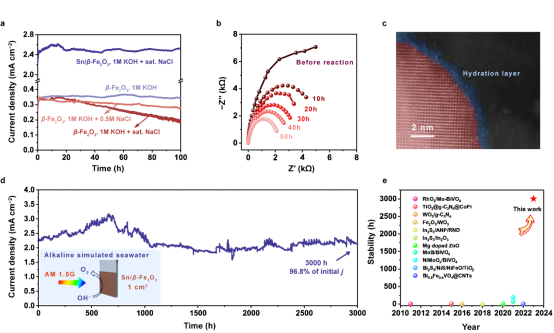 論文中提出了晶格中的Sn增強金屬-氧相互作用的原理,Sn的存在顯著增強了M-O鍵的強度,防止反應中間體局部高濃度的質子對晶格的攻擊,提高了晶體結構的穩定性。制備的Sn/β-Fe2O3光陽極在長時間反應后僅在淺層表面檢測到重構的發生和Cl?的吸附。在模擬海水電解液中工作3000小時后,光電流仍然保持在初始值的96.8%,是目前世界上穩定性最高的光陽極材料。此外,該工作對材料在海水中腐蝕機理的探究,以及在防腐蝕領域的探索也具有重要意義。